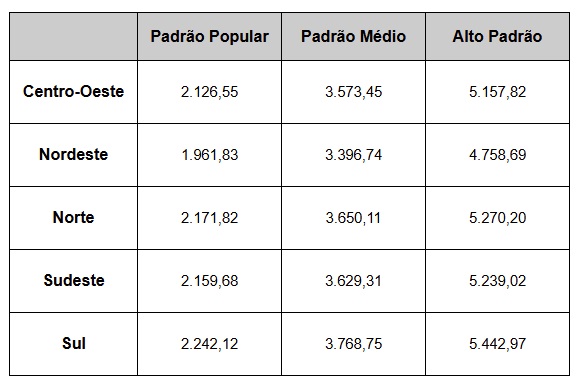 • O custo de construção por m2 no Padrão Médio na Região Norte é de R$3.650,11.